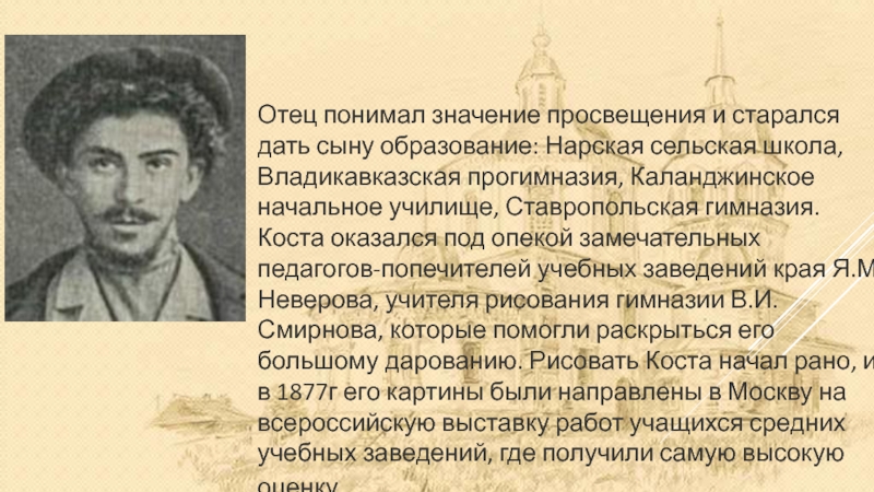 школа, Владикавказская прогимназия, Каланджинское начальное училище, Ставропольская гимназия. Коста оказался под опекой замечательных педагогов-попечителей учебных заведений края Я.М. Неверова, учителя рисования гимназии В.И. Смирнова, которые помогли раскрыться его большому дарованию. Рисовать Коста начал рано, и в 1877г его картины были направлены в Москву на всероссийскую выставку работ учащихся средних учебных заведений, где получили самую высокую оценку.