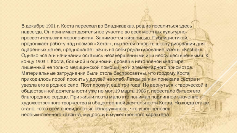 навсегда. Он принимает деятельное участие во всех местных культурно-просветительских мероприятия. Занимается живописью. Публицистикой, продолжает работу над поэмой «Хетаг», пытается открыть школу рисования для одаренных детей, предполагает взять на себя редактирование газеты «Казбек». Однако все эти начинания остались незавершенными или неосуществленными. К концу 1903 г. Коста, больной и одинокий, провел в нетопленой квартире, лишенный не только медицинской помощи, но и элементарного присмотра. Материальные затруднения были столь беспросветны, что гордому Коста приходилось порой просить у друзей на хлеб. Летом за ним приехала сестра и увезла его в родное село. Поэт прожил еще три года. Но вернуться к творческой и общественной деятельности уже не мог. 19 марта 1906 г. перестало биться его благородное сердце. При жизни поэта мало кто понимал подлинное значение художественного творчества и общественной деятельности Коста. Но когда его не стало, то со всей очевидностью обнаружилось, что ушел человек необыкновенного таланта, мудрости и мужественного характера