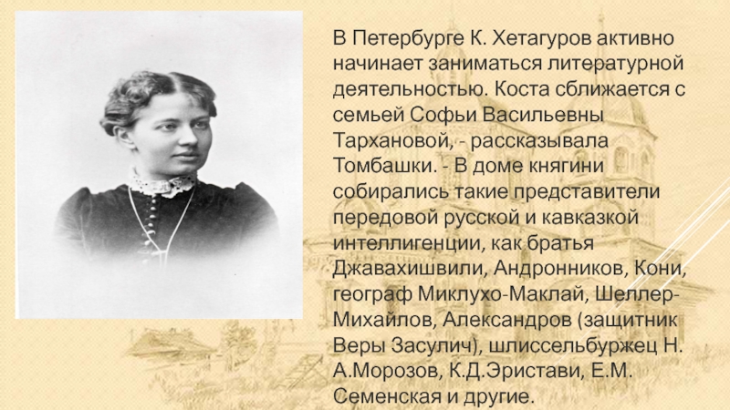 с семьей Софьи Васильевны Тархановой, - рассказывала Томбашки. - В доме княгини собирались такие представители передовой русской и кавказкой интеллигенции, как братья Джавахишвили, Андронников, Кони, географ Миклухо-Маклай, Шеллер-Михайлов, Александров (защитник Веры Засулич), шлиссельбуржец Н.А.Морозов, К.Д.Эристави, Е.М. Семенская и другие.