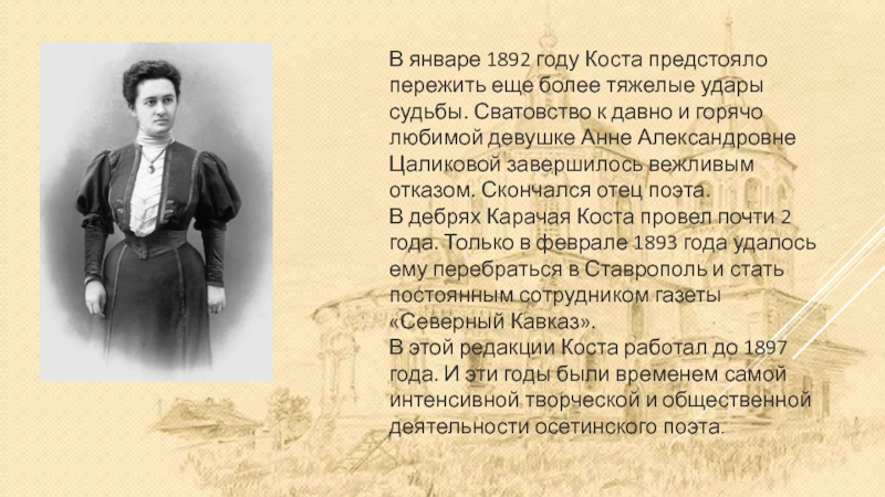 судьбы. Сватовство к давно и горячо любимой девушке Анне Александровне Цаликовой завершилось вежливым отказом. Скончался отец поэта.