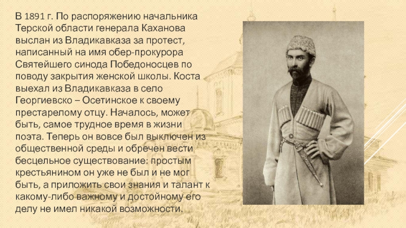 из Владикавказа за протест, написанный на имя обер-прокурора Святейшего синода Победоносцев по поводу закрытия женской школы. Коста выехал из Владикавказа в село Георгиевско – Осетинское к своему престарелому отцу. Началось, может быть, самое трудное время в жизни поэта. Теперь он вовсе был выключен из общественной среды и обречен вести бесцельное существование: простым крестьянином он уже не был и не мог быть, а приложить свои знания и талант к какому-либо важному и достойному его делу не имел никакой возможности.