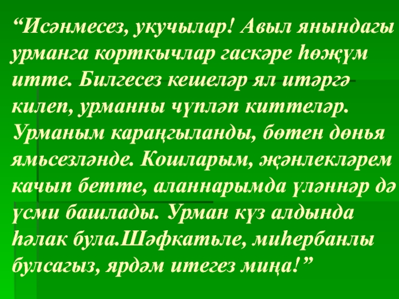 Слайд 4 “Исәнмесез, укучылар! Авыл янындагы урманга корткычлар гаскәре һөҗүм итте. Билгесез кешеләр