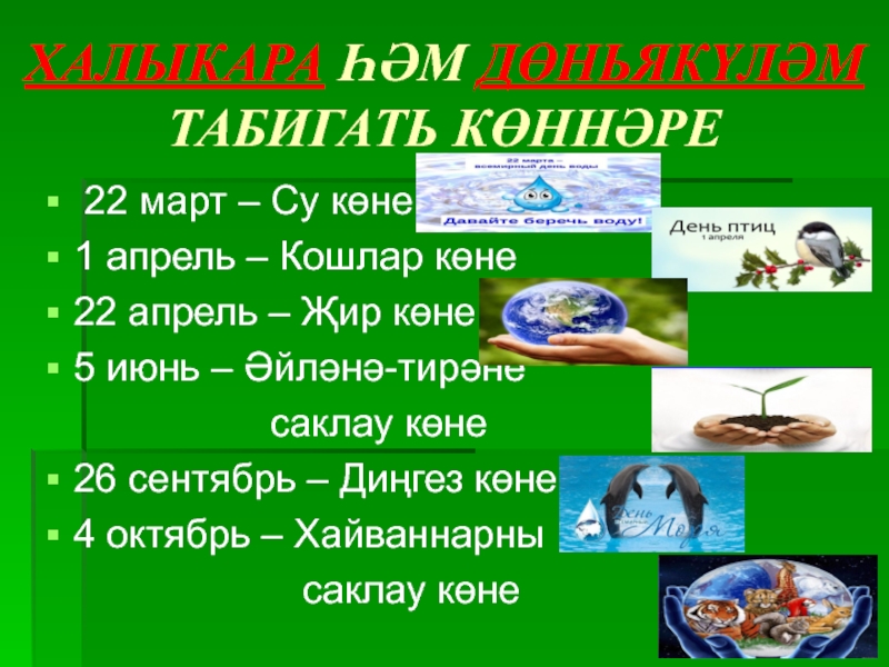 ХАЛЫКАРА ҺӘМ ДӨНЬЯКҮЛӘМ ТАБИГАТЬ КӨННӘРЕ 22 март – Су көне1 апрель – Кошлар көне22 апрель – Җир