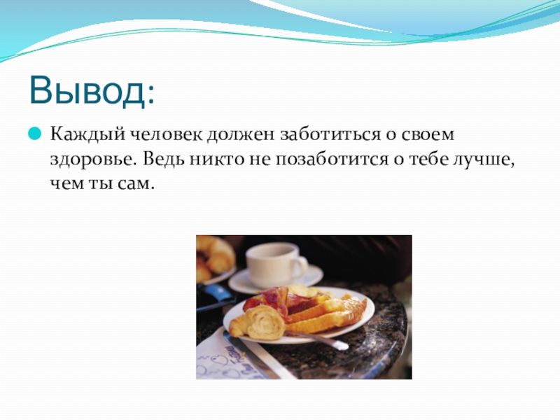Вывод:Каждый человек должен заботиться о своем здоровье. Ведь никто не позаботится о тебе лучше, чем ты сам.
