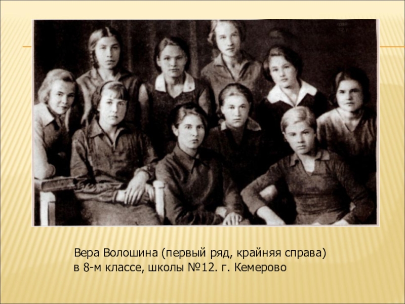 Слайд 9Вера Волошина (первый ряд, крайняя справа) в 8-м классе, школы №12.