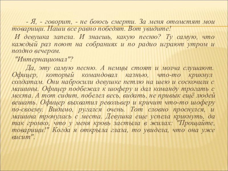 Да, эту самую песню. А немцы стоят и молча слушают. Офицер, который командовал казнью, что-то крикнул солдатам. Они набросили девушке петлю на шею и соскочили с машины. Офицер подбежал к шоферу и дал команду трогать с места. А тот сидит, побелел весь, видать, не привык ещё людей вешать. Офицер выхватил револьвер и кричит что-то шоферу по-своему. Видимо, ругался очень. Тот словно проснулся, и машина тронулась с места. Девушка еще успела крикнуть, да так громко, что у меня кровь застыла в жилах: "Прощайте, товарищи!" Когда я открыла глаза, то увидела, что она уже висит".