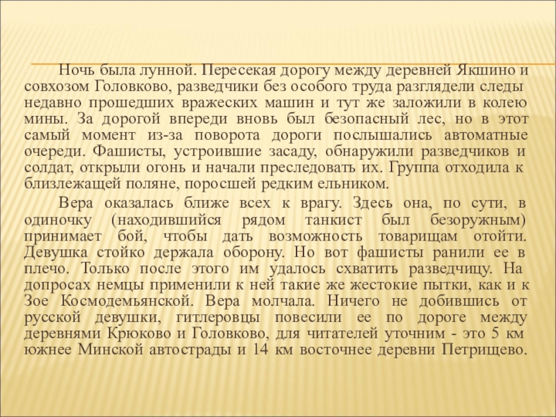 Слайд 19 Ночь была лунной. Пересекая дорогу между деревней Якшино и совхозом Головково,