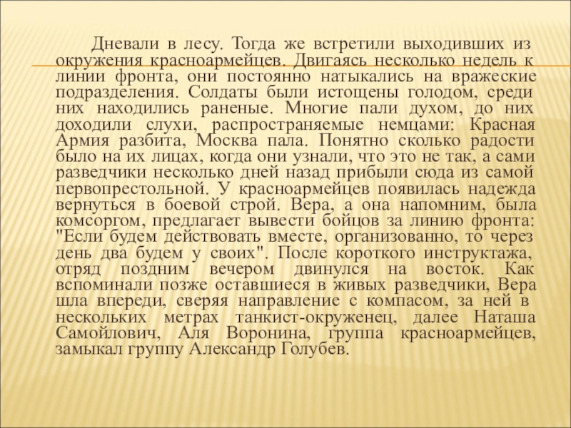 Слайд 18 Дневали в лесу. Тогда же встретили выходивших из окружения красноармейцев. Двигаясь