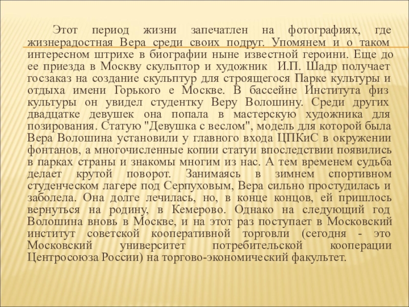 подруг. Упомянем и о таком интересном штрихе в биографии ныне известной героини. Еще до ее приезда в Москву скульптор и художник И.П. Шадр получает госзаказ на создание скульптур для строящегося Парке культуры и отдыха имени Горького е Москве. В бассейне Института физкультуры он увидел студентку Веру Волошину. Среди других двадцатке девушек она попала в мастерскую художника для позирования. Статую "Девушка с веслом", модель для которой была Вера Волошина установили у главного входа ЦПКиС в окружении фонтанов, а многочисленные копии статуи впоследствии появились в парках страны и знакомы многим из нас. А тем временем судьба делает крутой поворот. Занимаясь в зимнем спортивном студенческом лагере под Серпуховым, Вера сильно простудилась и заболела. Она долге лечилась, но, в конце концов, ей пришлось вернуться на родину, в Кемерово. Однако на следующий год Волошина вновь в Москве, и на этот раз поступает в Московский институт советской кооперативной торговли (сегодня - это Московский университет потребительской кооперации Центросоюза России) на торгово-экономический факультет.