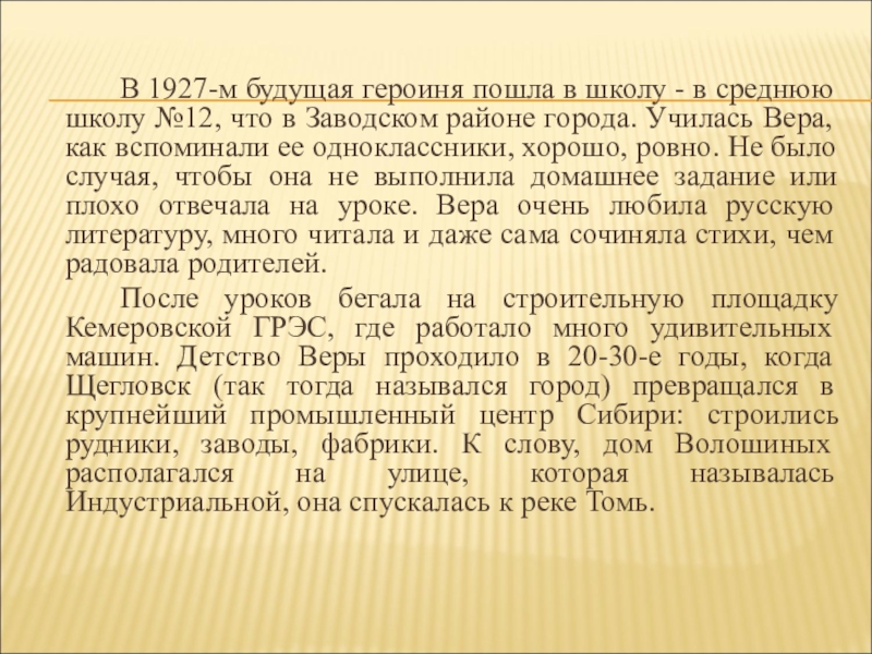 После уроков бегала на строительную площадку Кемеровской ГРЭС, где работало много удивительных машин. Детство Веры проходило в 20-30-е годы, когда Щегловск (так тогда назывался город) превращался в крупнейший промышленный центр Сибири: строились рудники, заводы, фабрики. К слову, дом Волошиных располагался на улице, которая называлась Индустриальной, она спускалась к реке Томь.