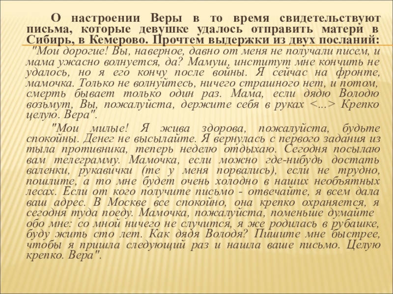 Слайд 14 О настроении Веры в то время свидетельствуют письма, которые девушке удалось