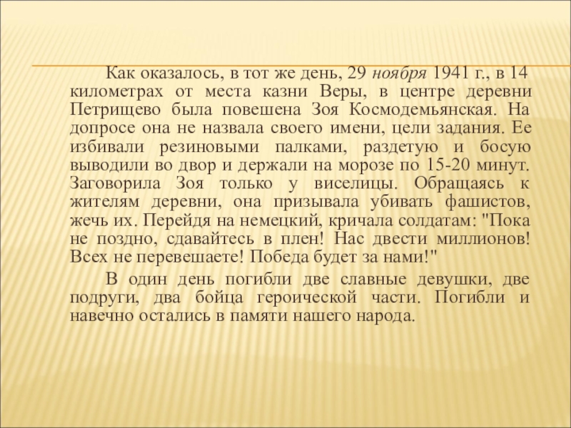 14 километрах от места казни Веры, в центре деревни Петрищево была повешена Зоя Космодемьянская. На допросе она не назвала своего имени, цели задания. Ее избивали резиновыми палками, раздетую и босую выводили во двор и держали на морозе по 15-20 минут. Заговорила Зоя только у виселицы. Обращаясь к жителям деревни, она призывала убивать фашистов, жечь их. Перейдя на немецкий, кричала солдатам: "Пока не поздно, сдавайтесь в плен! Нас двести миллионов! Всех не перевешаете! Победа будет за нами!"