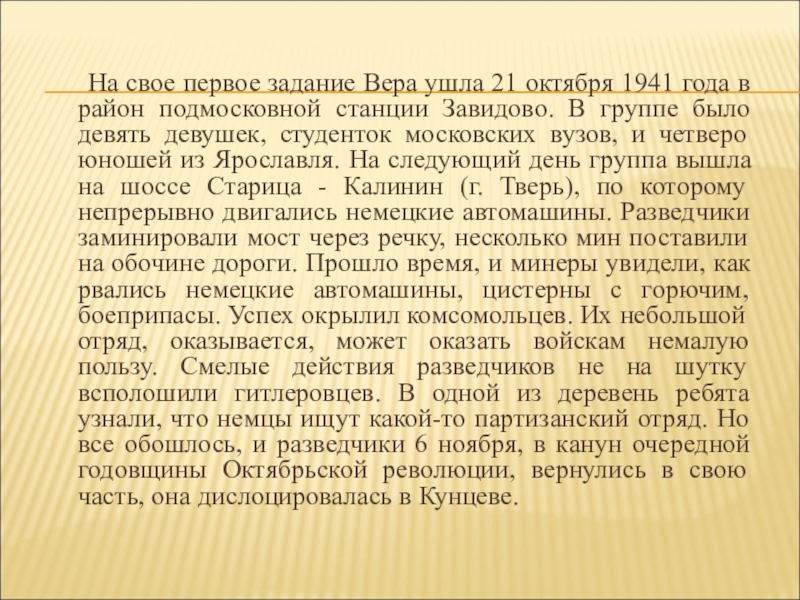 район подмосковной станции Завидово. В группе было девять девушек, студенток московских вузов, и четверо юношей из Ярославля. На следующий день группа вышла на шоссе Старица - Калинин (г. Тверь), по которому непрерывно двигались немецкие автомашины. Разведчики заминировали мост через речку, несколько мин поставили на обочине дороги. Прошло время, и минеры увидели, как рвались немецкие автомашины, цистерны с горючим, боеприпасы. Успех окрылил комсомольцев. Их небольшой отряд, оказывается, может оказать войскам немалую пользу. Смелые действия разведчиков не на шутку всполошили гитлеровцев. В одной из деревень ребята узнали, что немцы ищут какой-то партизанский отряд. Но все обошлось, и разведчики 6 ноября, в канун очередной годовщины Октябрьской революции, вернулись в свою часть, она дислоцировалась в Кунцеве.