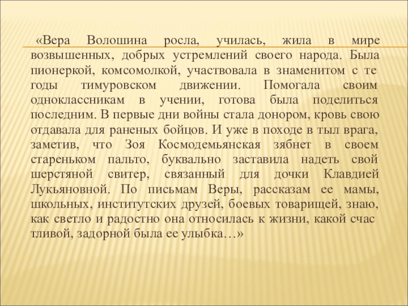 Слайд 29 «Вера Волошина росла, училась, жила в мире возвышенных, добрых устремлений своего