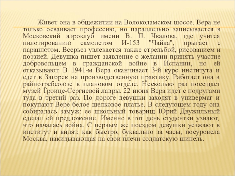 профессию, но параллельно записывается в Московский аэроклуб имени В. П. Чкалова, где учится пилотированию самолетом И-153 "Чайка", прыгает с парашютом. Всерьез увлекается также стрельбой, рисованием и поэзией. Девушка пишет заявление о желании принять участие добровольцем в гражданской войне в Испании, но ей отказывают. В 1941-м Вера оканчивает 3-й курс института и едет в Загорск на производственную практику. Работает она в райпотребсоюзе в плановом отделе. Несколько раз посещает музей Троице-Сергиевой лавры. 22 июня Вера идет с подругами туда в третий раз. По дороге девушки заходят в универмаг и покупают Вере белое шелковое платье. В следующем году она собиралась замуж: ее школьный товарищ Юрий Двужильный сделал ей предложение. Именно в тот день студентки узнают, что началась война. С первым же поездом девушки уезжают в институт и видят, как быстро, буквально за часы, посуровела Москва, накидывающая на свои плечи солдатскую шинель.