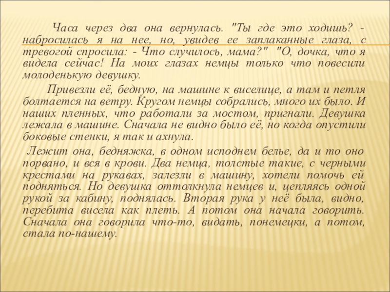 набросилась я на нее, но, увидев ее заплаканные глаза, с тревогой спросила: - Что случилось, мама?" "О, дочка, что я видела сейчас! На моих глазах немцы только что повесили молоденькую девушку.
