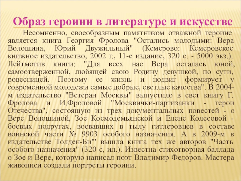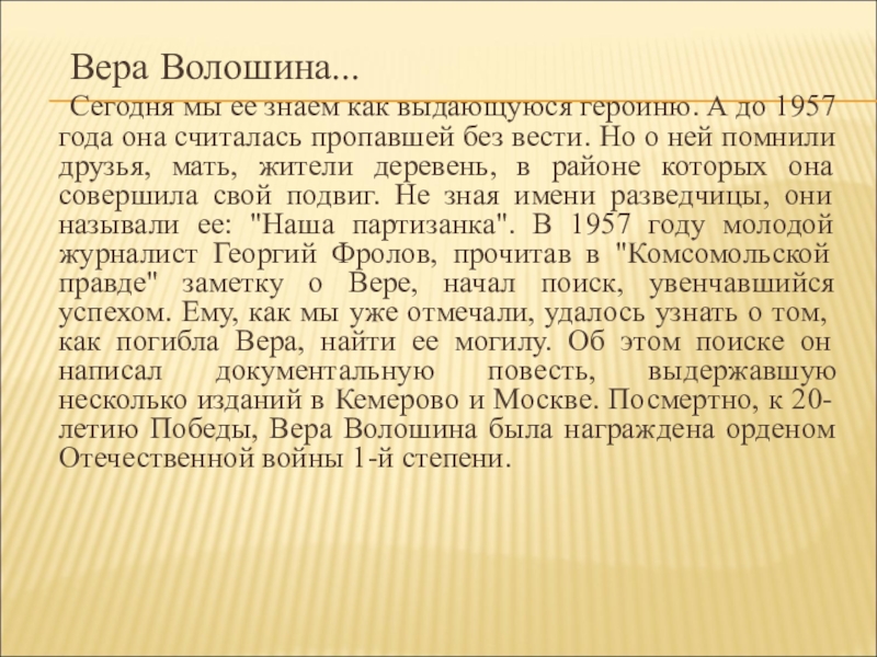 Слайд 2 Вера Даниловна Волошина (1919-1941 гг.)-одна из выдающихся героинь Отечества, Герой Российской