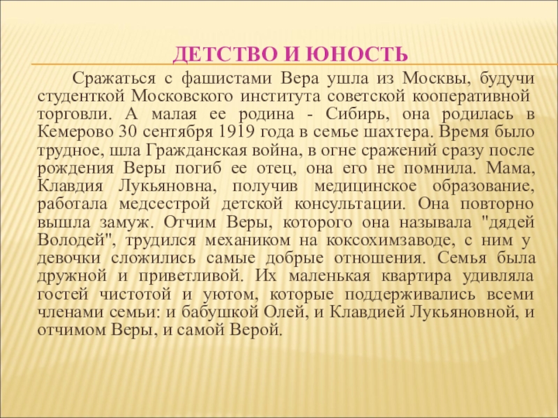 Московского института советской кооперативной торговли. А малая ее родина - Сибирь, она родилась в Кемерово 30 сентября 1919 года в семье шахтера. Время было трудное, шла Гражданская война, в огне сражений сразу после рождения Веры погиб ее отец, она его не помнила. Мама, Клавдия Лукьяновна, получив медицинское образование, работала медсестрой детской консультации. Она повторно вышла замуж. Отчим Веры, которого она называла "дядей Володей", трудился механиком на коксохимзаводе, с ним у девочки сложились самые добрые отношения. Семья была дружной и приветливой. Их маленькая квартира удивляла гостей чистотой и уютом, которые поддерживались всеми членами семьи: и бабушкой Олей, и Клавдией Лукьяновной, и отчимом Веры, и самой Верой.