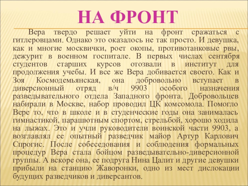 это оказалось не так просто. И девушка, как и многие москвички, роет окопы, противотанковые рвы, дежурит в военном госпитале. В первых числах сентября студентов старших курсов отозвали в институт для продолжения учебы. И все же Вера добивается своего. Как и Зоя Космодемьянская, она добровольно вступает в диверсионный отряд в/ч 9903 особого назначения разведывательного отдела Западного фронта. Добровольцев набирали в Москве, набор проводил ЦК комсомола. Помогло Вере то, что в школе и в студенческие годы она занималась гимнастикой, парашютным спортом, стрельбой, хорошо ходила на лыжах. Это и учли руководители воинской части 9903, а возглавлял ее опытный разведчик майор Артур Карлович Спрогис. После собеседования и соблюдения формальных процедур Вера стала бойцом разведывательно-диверсионной группы. А вскоре она, ее подруга Нина Цалит и другие девушки прибыли на станцию Жаворонки, одно из мест дислокации будущих разведчиков и диверсантов.