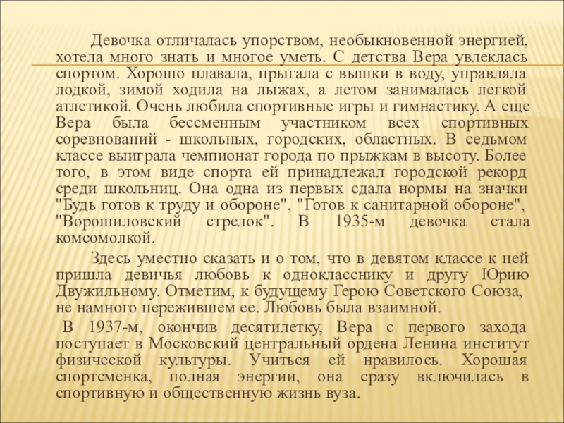 С детства Вера увлеклась спортом. Хорошо плавала, прыгала с вышки в воду, управляла лодкой, зимой ходила на лыжах, а летом занималась легкой атлетикой. Очень любила спортивные игры и гимнастику. А еще Вера была бессменным участником всех спортивных соревнований - школьных, городских, областных. В седьмом классе выиграла чемпионат города по прыжкам в высоту. Более того, в этом виде спорта ей принадлежал городской рекорд среди школьниц. Она одна из первых сдала нормы на значки "Будь готов к труду и обороне", "Готов к санитарной обороне", "Ворошиловский стрелок". В 1935-м девочка стала комсомолкой.