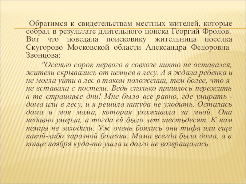 Слайд 21 Обратимся к свидетельствам местных жителей, которые собрал в результате длительного поиска