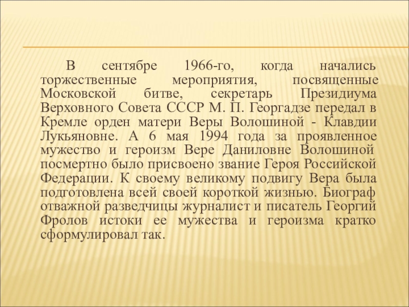 Слайд 28 В сентябре 1966-го, когда начались торжественные мероприятия, посвященные Московской битве, секретарь
