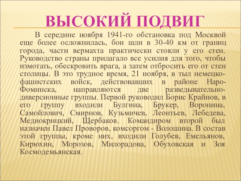 бои шли в 30-40 км от границ города, части вермахта практически стояли у его стен. Руководство страны прилагало все усилия для того, чтобы измотать, обескровить врага, а затем отбросить его от стен столицы. В это трудное время, 21 ноября, в тыл немецко-фашистских войск, действовавших в районе Наро-Фоминска, направляются две разведывательно-диверсионные группы. Первой руководил Борис Крайнов, в его группу входили Булгина, Брукер, Воронина, Самойлович, Смирнов, Кузьмичев, Леонтьев, Лебедева, Медиокрицкий, Щербаков. Командиром второй был назначен Павел Проворов, комсоргом - Волошина. В состав этой группы, кроме них, входили Голубев, Емельянов, Кирюхин, Морозов, Милорадова, Обуховская и Зоя Космодемьянская.
