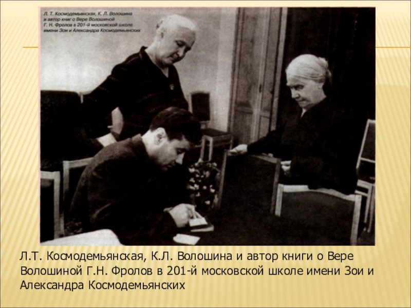 Слайд 30Л.Т. Космодемьянская, К.Л. Волошина и автор книги о Вере Волошиной Г.Н.