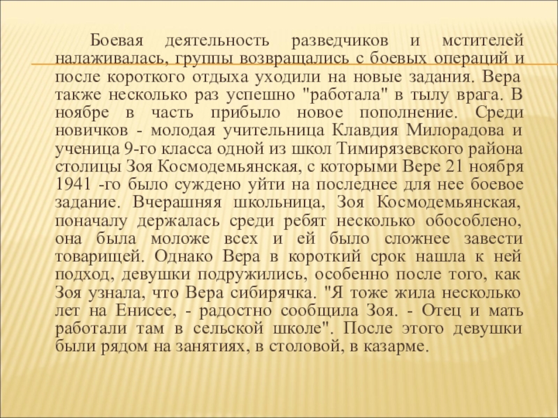 и после короткого отдыха уходили на новые задания. Вера также несколько раз успешно "работала" в тылу врага. В ноябре в часть прибыло новое пополнение. Среди новичков - молодая учительница Клавдия Милорадова и ученица 9-го класса одной из школ Тимирязевского района столицы Зоя Космодемьянская, с которыми Вере 21 ноября 1941 -го было суждено уйти на последнее для нее боевое задание. Вчерашняя школьница, Зоя Космодемьянская, поначалу держалась среди ребят несколько обособлено, она была моложе всех и ей было сложнее завести товарищей. Однако Вера в короткий срок нашла к ней подход, девушки подружились, особенно после того, как Зоя узнала, что Вера сибирячка. "Я тоже жила несколько лет на Енисее, - радостно сообщила Зоя. - Отец и мать работали там в сельской школе". После этого девушки были рядом на занятиях, в столовой, в казарме.