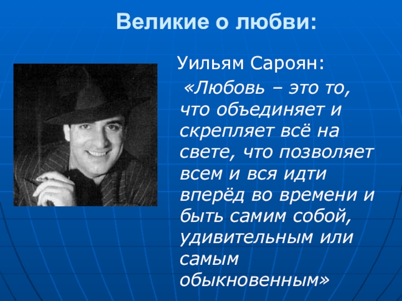 Великие о любви: Уильям Сароян:  «Любовь – это то, что объединяет и скрепляет всё на свете,
