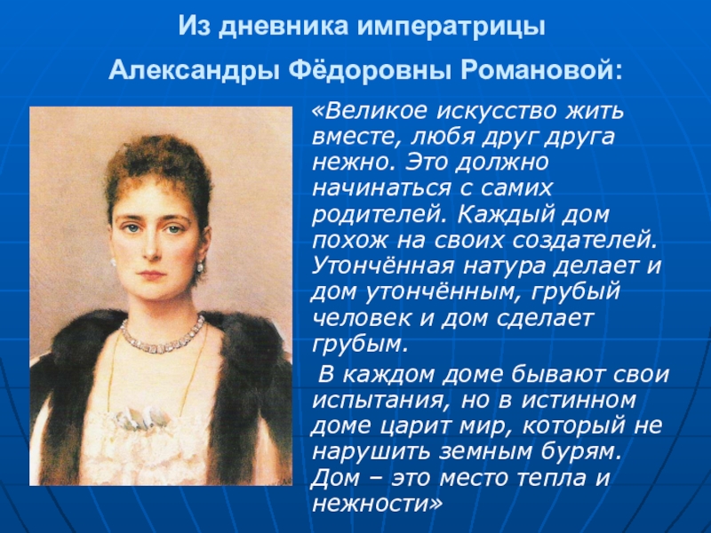 Из дневника императрицы  Александры Фёдоровны Романовой:  «Великое искусство жить вместе, любя друг друга нежно. Это