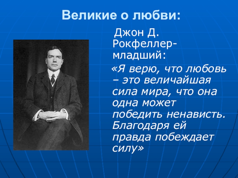Великие о любви:  Джон Д. Рокфеллер-младший: «Я верю, что любовь – это величайшая сила мира, что
