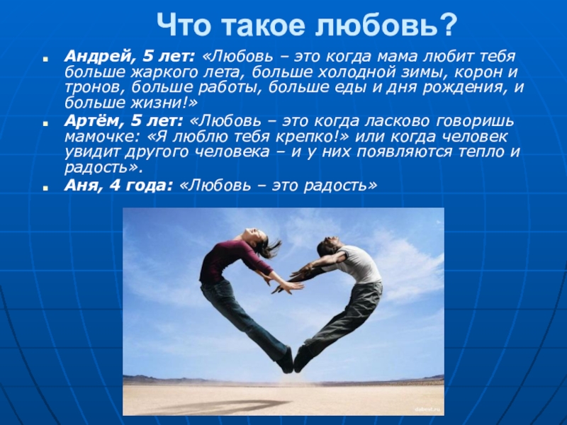 Что такое любовь? Витя, 7 лет: «Любовь – это когда у мамы и папы есть сын».Александра, 7
