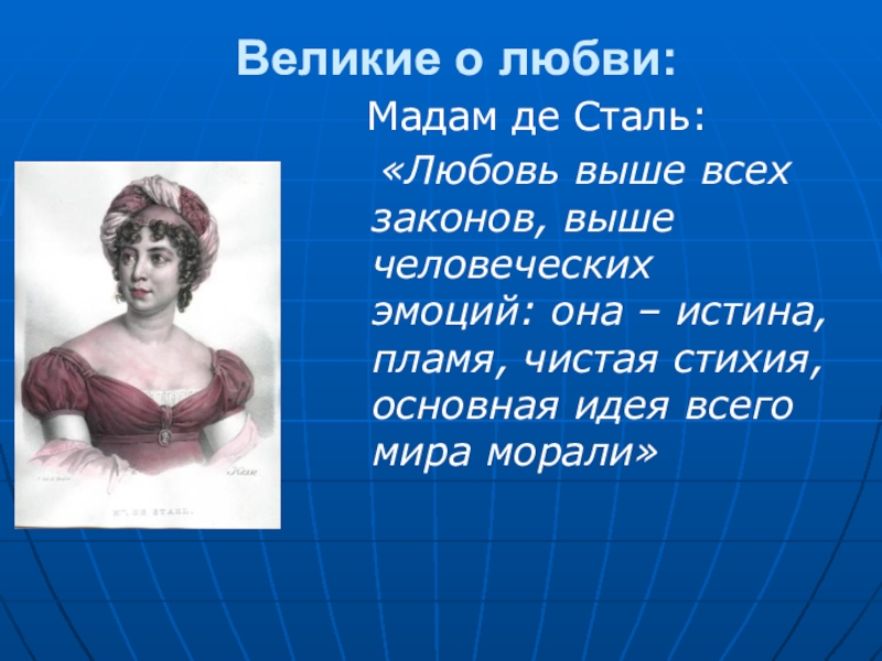 Великие о любви:  Мадам де Сталь:  «Любовь выше всех законов, выше человеческих эмоций: она –