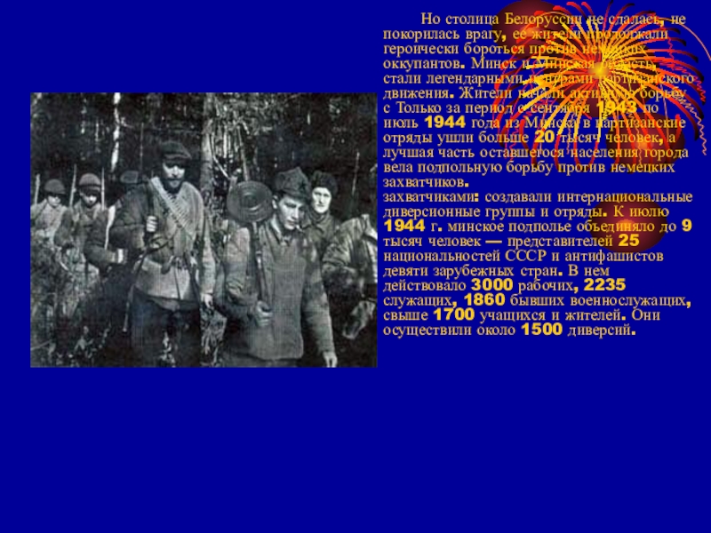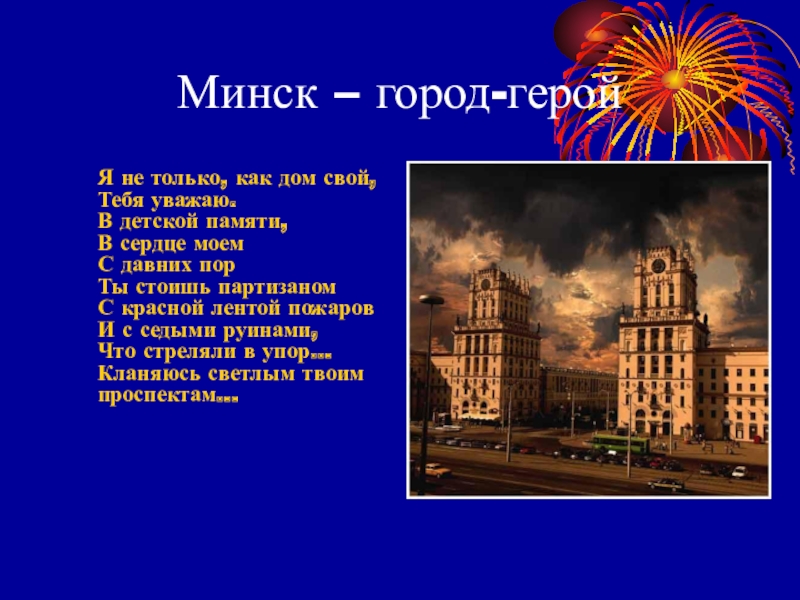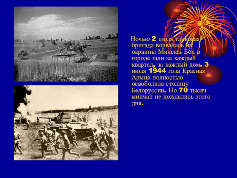 Страшную картину представлял освобожденный Минск. Города не было: на его руинах уже успели вырасти полевые цветы. Уцелевшие минчане срывали их, вручали солдатам, забрасывали букетами раскаленную от солнца и боя танковую броню. Войска двигались дальше: им предстояло еще не один день воевать за Беларусь.