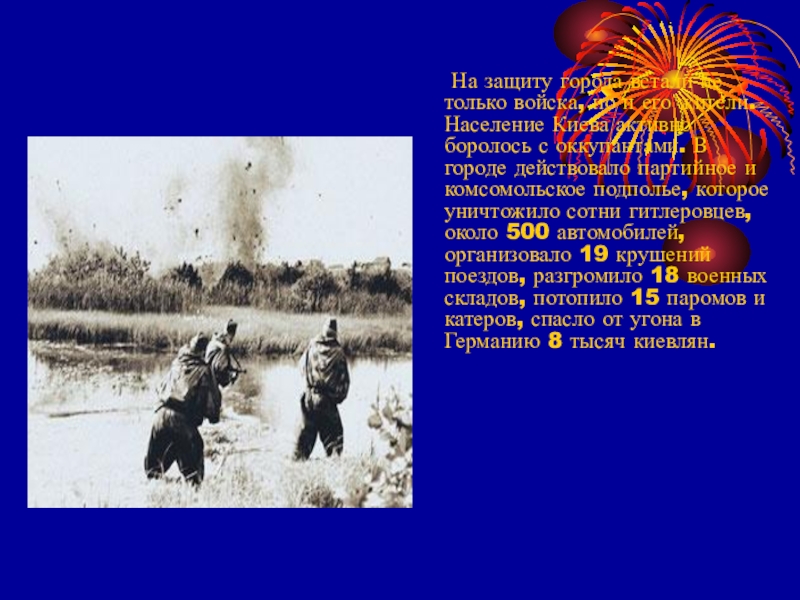 Гитлеровцы установили жестокий оккупационный режим. Были созданы концлагеря (Дарницкий, Сырецкий). Бабий Яр стал местом массовых казней советских военнопленных и мирных жителей. В Киеве гитлеровцы уничтожили св. 200 тыс советских граждан, 100 тыс человек угнали на принудительные работы в Германию