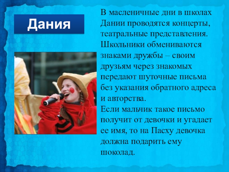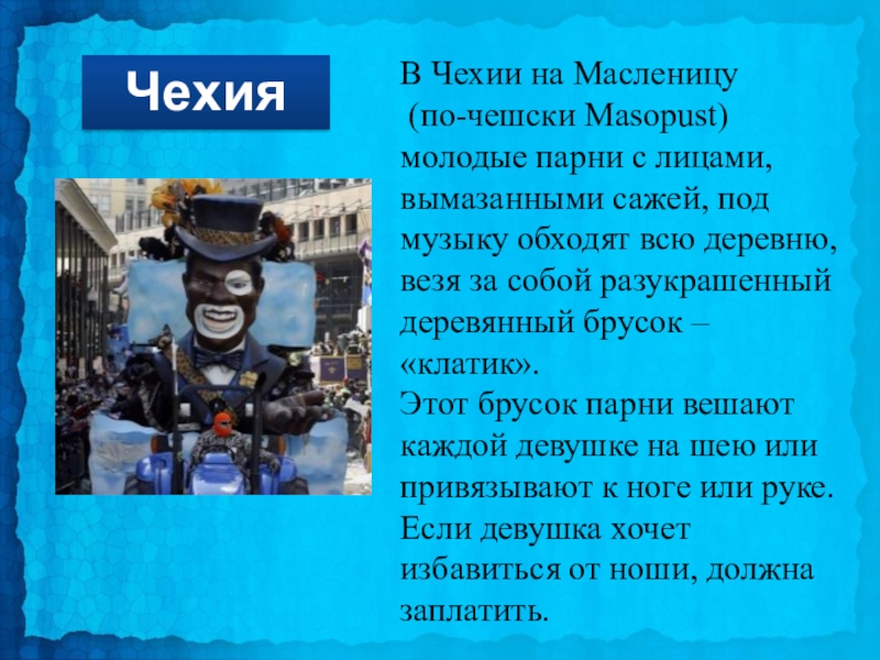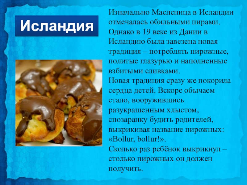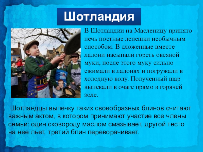 В Шотландии на Масленицу принято печь постные лепешки необычным способом. В сложенные вместе ладони насыпали горсть овсяной муки, после этого муку сильно сжимали в ладонях и погружали в холодную воду. Полученный шар выпекали в очаге прямо в горячей золе.