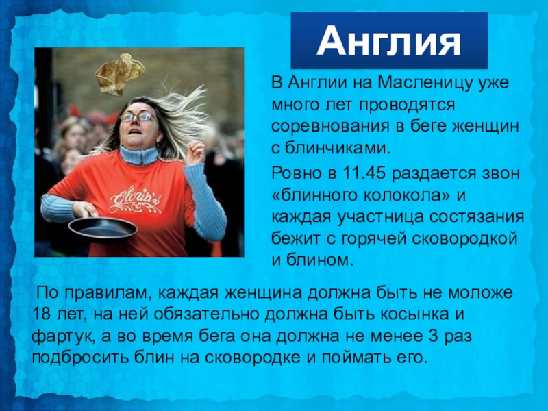 В Англии на Масленицу уже много лет проводятся соревнования в беге женщин с блинчиками.