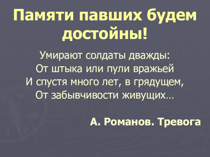 Памяти павших будем достойны!Умирают солдаты дважды:От штыка или пули вражьейИ спустя много лет, в грядущем,От забывчивости живущих…А. Романов. Тревога