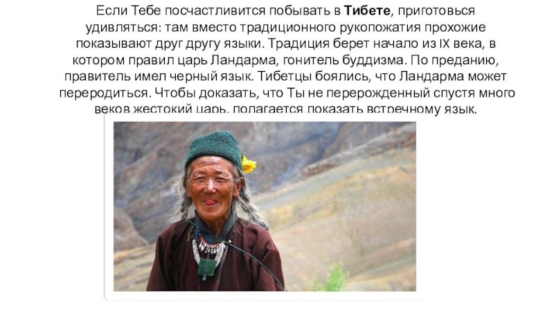 Слайд 7Если Тебе посчастливится побывать в Тибете, приготовься удивляться: там вместо традиционного рукопожатия