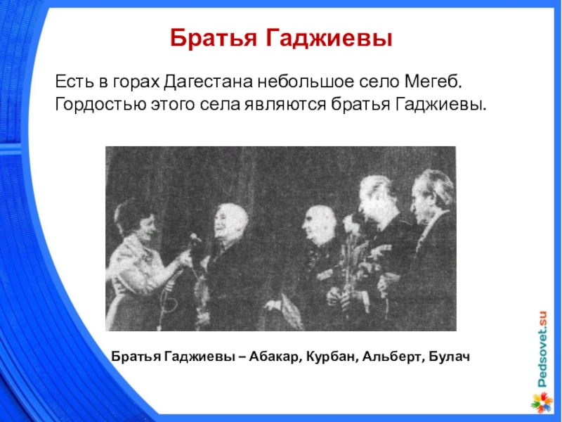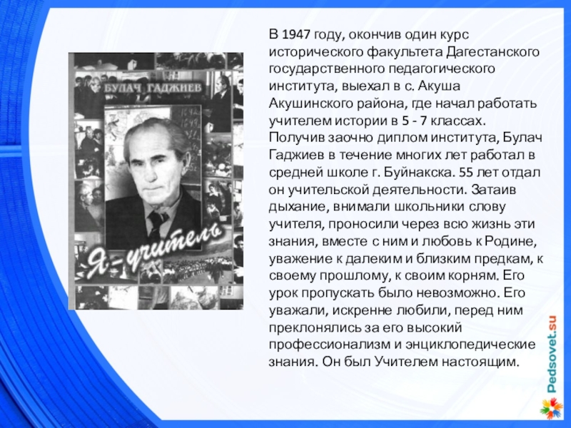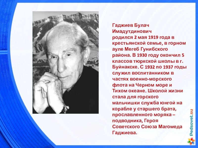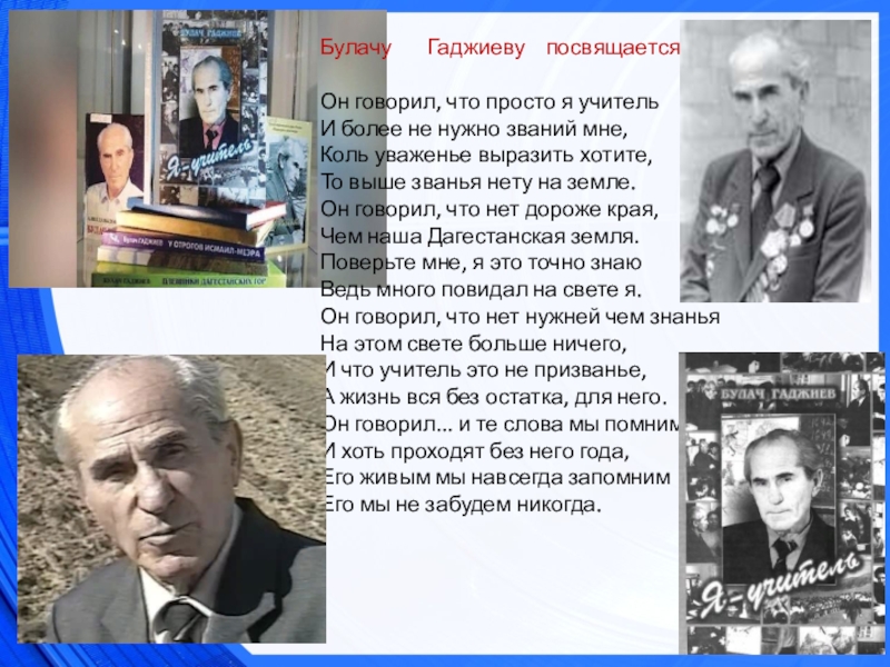 Слайд 2Булач Имадутдинович Гаджиев — народный учитель СССР, заслуженный учитель Дагестана и РСФСР,