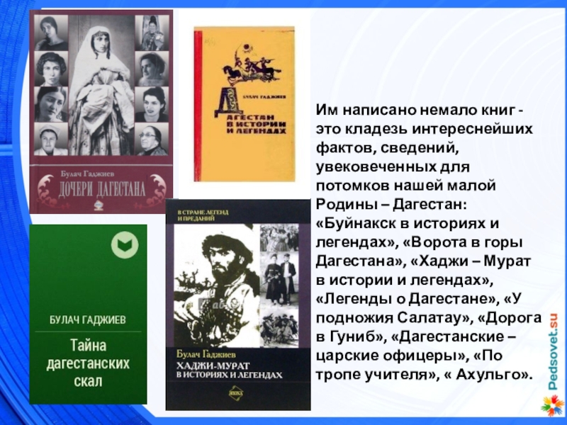 для потомков нашей малой Родины – Дагестан: «Буйнакск в историях и легендах», «Ворота в горы Дагестана», «Хаджи – Мурат в истории и легендах», «Легенды о Дагестане», «У подножия Салатау», «Дорога в Гуниб», «Дагестанские – царские офицеры», «По тропе учителя», « Ахульго».