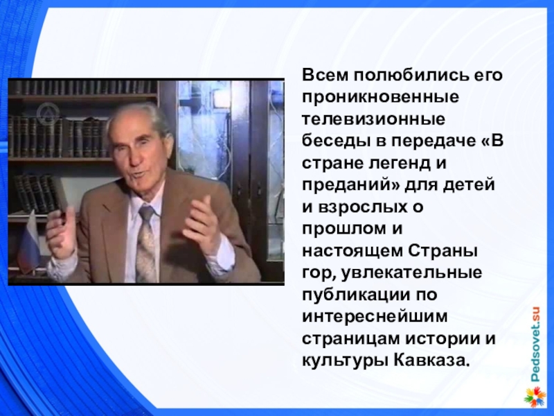 Слайд 10Всем полюбились его проникновенные телевизионные беседы в передаче «В стране легенд