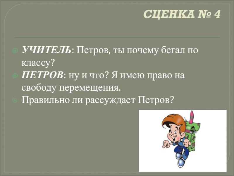 УЧИТЕЛЬ: Петров, ты почему бегал по классу?