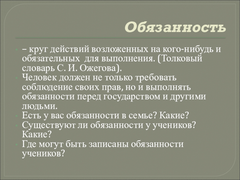 Человек должен не только требовать соблюдение своих прав, но и выполнять обязанности перед государством и другими людьми.