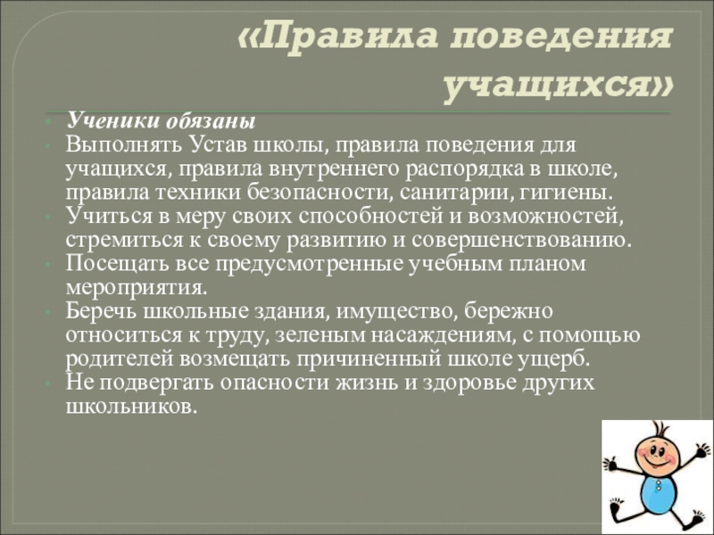 Выполнять Устав школы, правила поведения для учащихся, правила