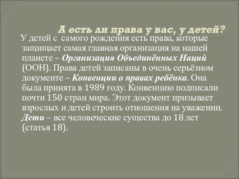 с самого рождения есть права, которые защищает самая главная организация на нашей планете – Организация Объединённых Наций (ООН). Права детей записаны в очень серьёзном документе – Конвенции о правах ребёнка. Она была принята в 1989 году. Конвенцию подписали почти 150 стран мира. Этот документ призывает взрослых и детей строить отношения на уважении.