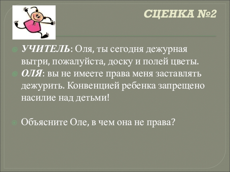 ОЛЯ: вы не имеете права меня заставлять дежурить. Конвенцией ребенка запрещено насилие над детьми!