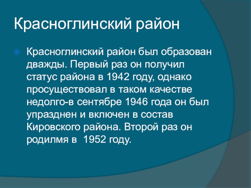 Красноглинский район был образован дважды. Первый раз он получил статус