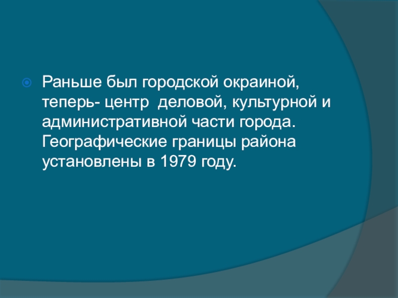 Раньше был городской окраиной, теперь- центр деловой, культурной и административной части